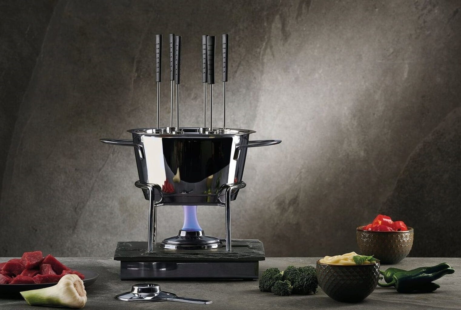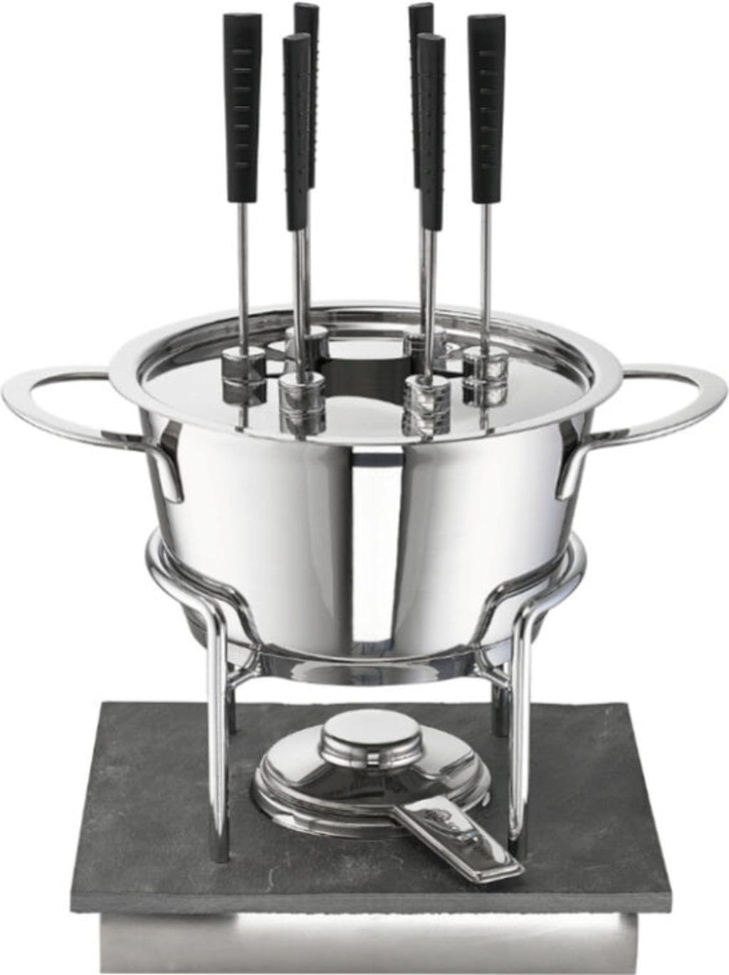 ¡Un auténtico festín para la vista y el paladar! Este set de fondue combina un aspecto de acero inoxidable brillante con un rechaud con un gran aspecto de pizarra. Gracias a su base especial, se puede precalentar en cualquier placa. Los seis tenedores incluidos en la entrega están marcados individualmente.