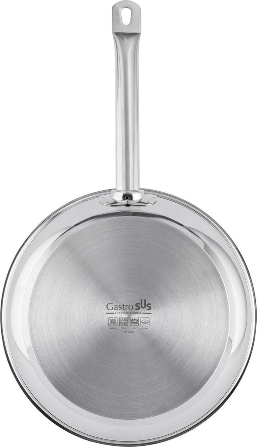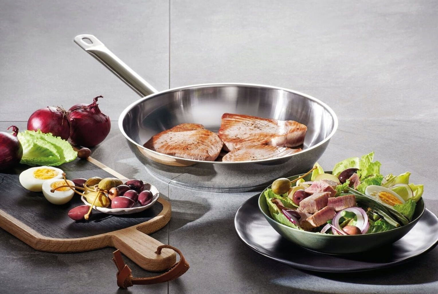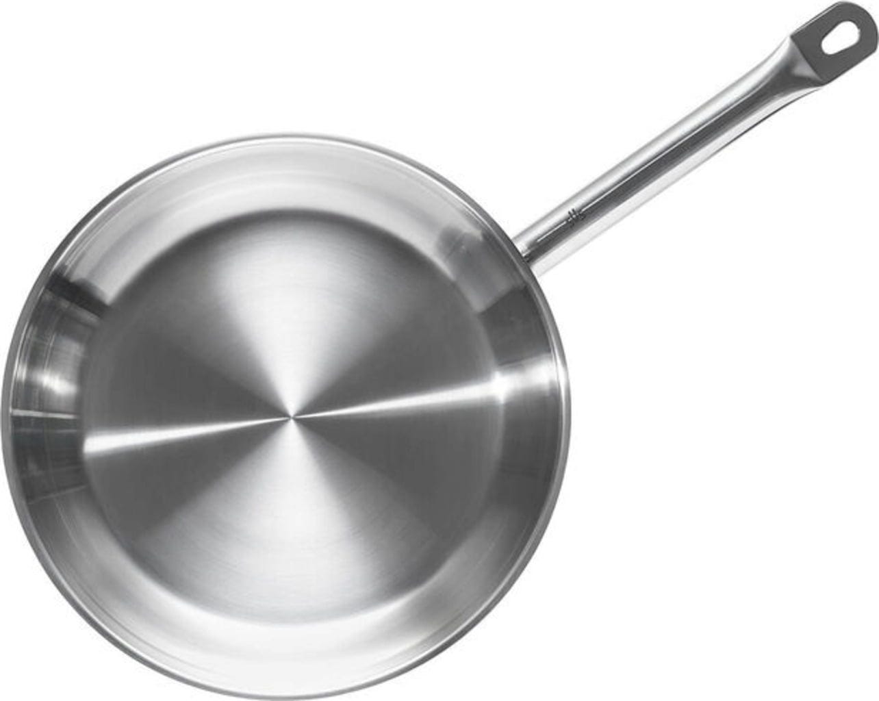 Una sartén profesional a un precio asequible. Incorpora un núcleo de aluminio entre la base de acero inoxidable de la sartén y la base de inducción, lo que hace que la sartén sea apta para todo tipo de fuegos y también ahorra energía. El borde especial permite verter el contenido con total seguridad.