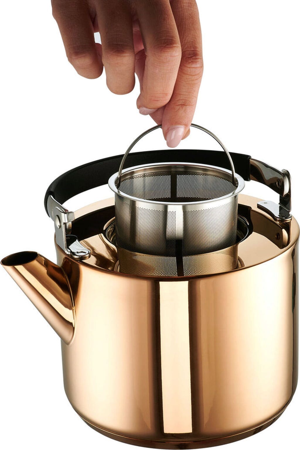 La tetera Katja es elegante y práctica. El acero inoxidable con un gran aspecto de cobre es compatible con cualquier tipo de placa. Una vez que el agua esté caliente, puedes preparar tu té favorito de inmediato gracias al colador extraíble.
