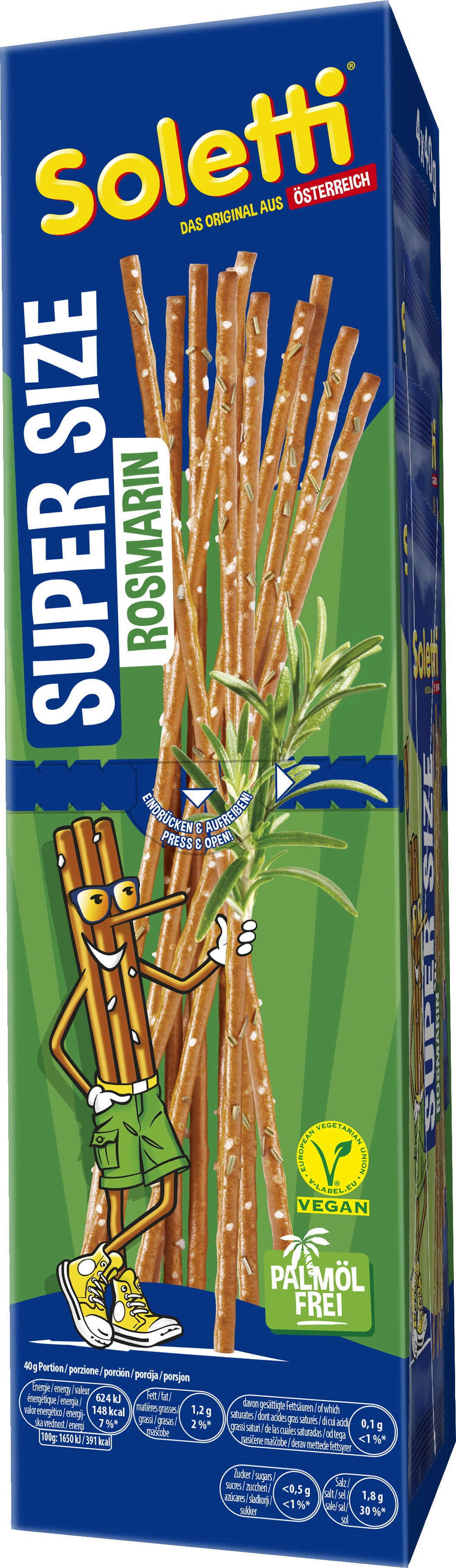 Estas barritas de sal SuperSize de Soletti se elaboran en Feldbach con cereales austriacos y sal de los Alpes austriacos. La receta sin aceite de palma está enriquecida con romero aromático.