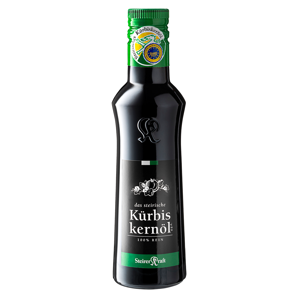 El aceite de semillas de calabaza de Estiria IGP premium de Steirerkraft se procesa a partir de materias primas 100 % naturales de agricultores directos de Estiria. Esto significa que las calabazas se cultivan la tierra de Estiria, las semillas se tuestan, prensan y el aceite se embotella en fábricas de Estiria. Una garantía de origen certificada por Steirerkraft.