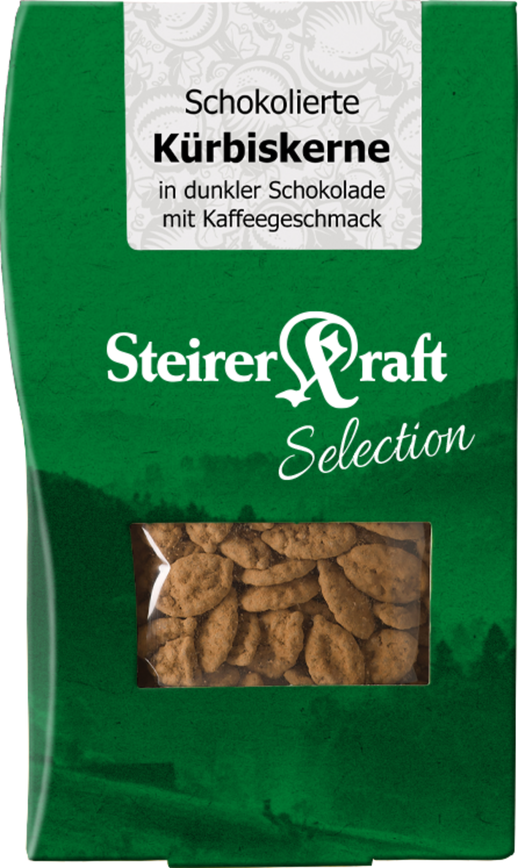 Disfruta con esta irresistible especialidad, en la que las crujientes semillas de calabaza de Estiria se unen con el fino chocolate negro. Al primer bocado, se desprende el aroma intenso y ligeramente amargo de la cáscara oscura, seguido del núcleo crujiente que, con su textura característica, proporciona el bocado perfecto. El delicado toque final de café en polvo aporta una nota apetitosa, que armoniza a la perfección con la base de sabor natural a fruto seco.