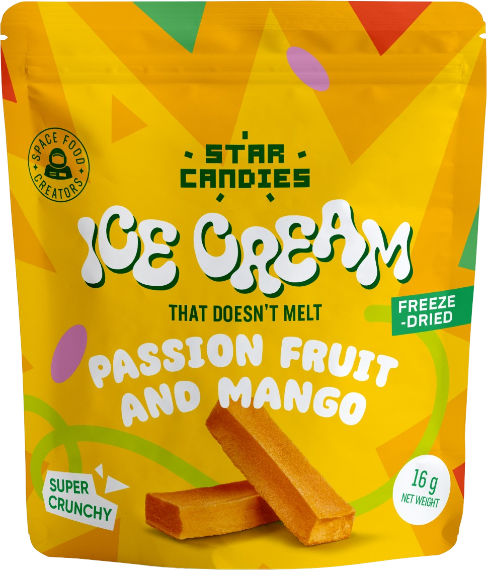 Descubre STAR CANDIES de Super Garden, un helado liofilizado de mango y maracuyá. Un postre extraordinario, con un sabor exótico y una textura ligera y crujiente que no se derrite: todo el placer del helado, sin necesidad de congelador.