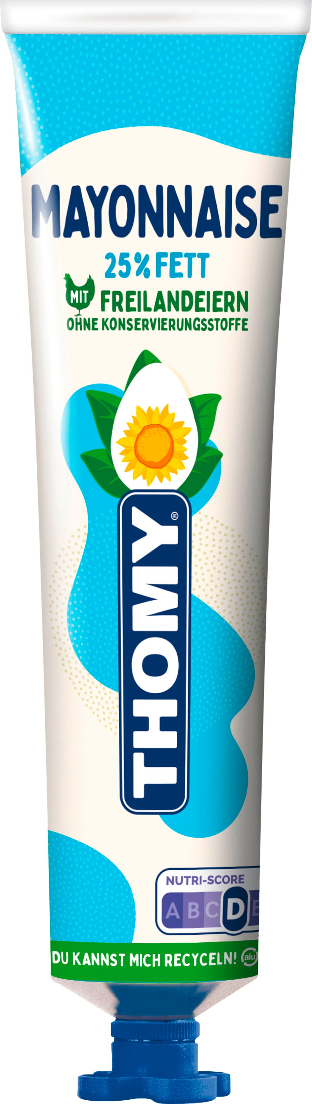La mayonesa THOMY con un 25% de materia grasa conquista por su consistencia cremosa y su bajo contenido en grasa. Ideal para cocinar, mojar o decorar tus platos favoritos. El práctico tubo que se puede volver a cerrar garantiza una fácil dosificación y una frescura duradera. Elaborada con huevos de corral.