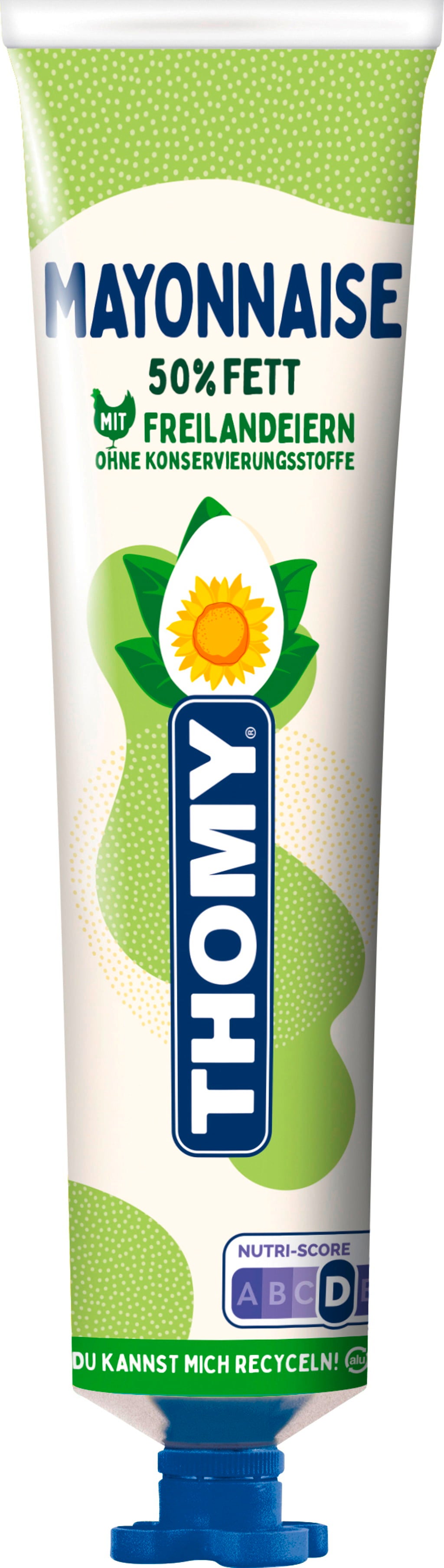 La mayonesa THOMY con un 50% de materia grasa, elaborada a partir de huevos de corral, ofrece todo el sabor y la cremosidad de la mayonesa con un contenido reducido de materia grasa. Perfecta para cocinar, mojar o decorar sus platos favoritos. El práctico tubo con cierre facilita la dosificación y conserva la mayonesa fresca durante más tiempo.