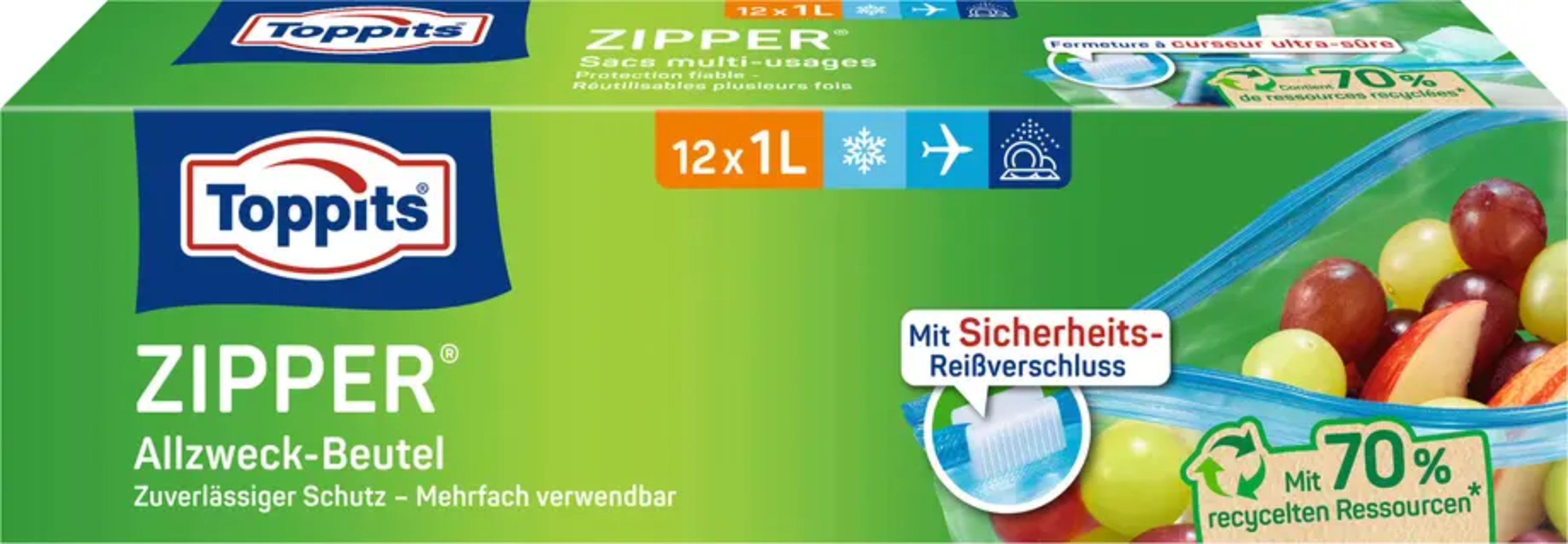 Las bolsas multiusos Zipper® de Toppits son prácticas bolsas resellables, ideales para conservar los alimentos de forma ordenada, congelar, transportar o guardar alimentos y objetos pequeños. Gracias al cierre de seguridad integrado con cremallera, se cierran de forma sencilla, hermética y fiable.