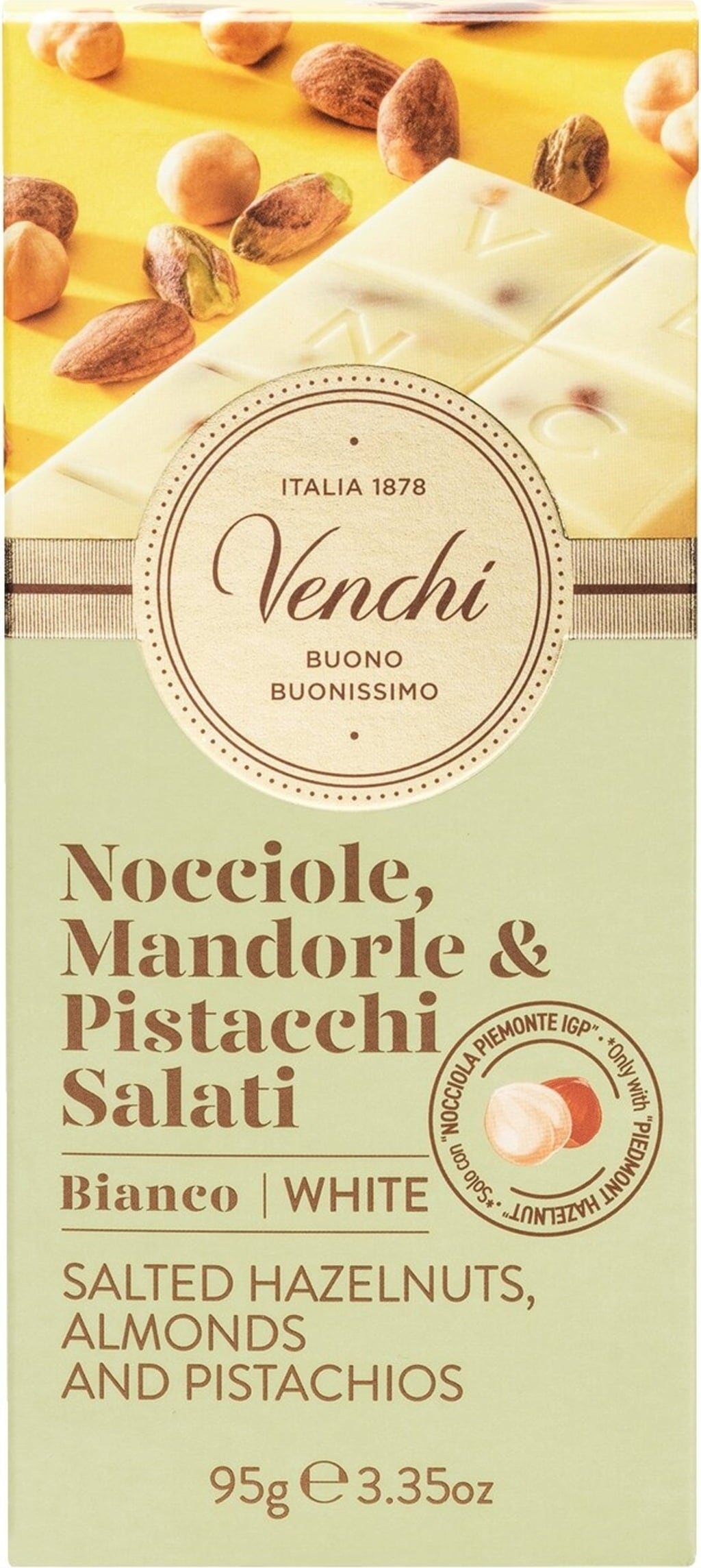 Venchi Tableta de Chocolate Blanco con Avellanas, Pistachos y Almendras Saladas, 95 g