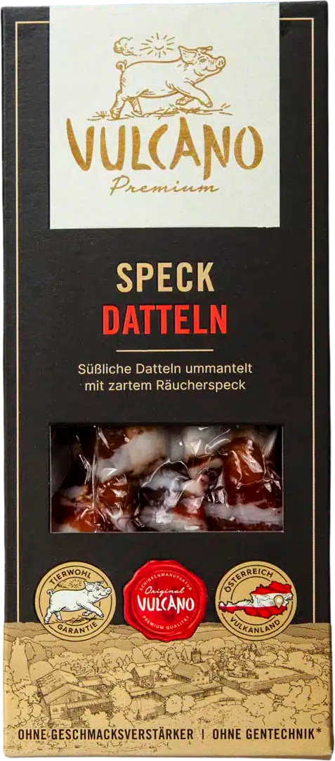 70 % Dátil, 30 % panceta ahumada (panceta, sal de mesa no yodada, especias, Azúcar, Glucosa, nitrito de sodio (E 250)[1])