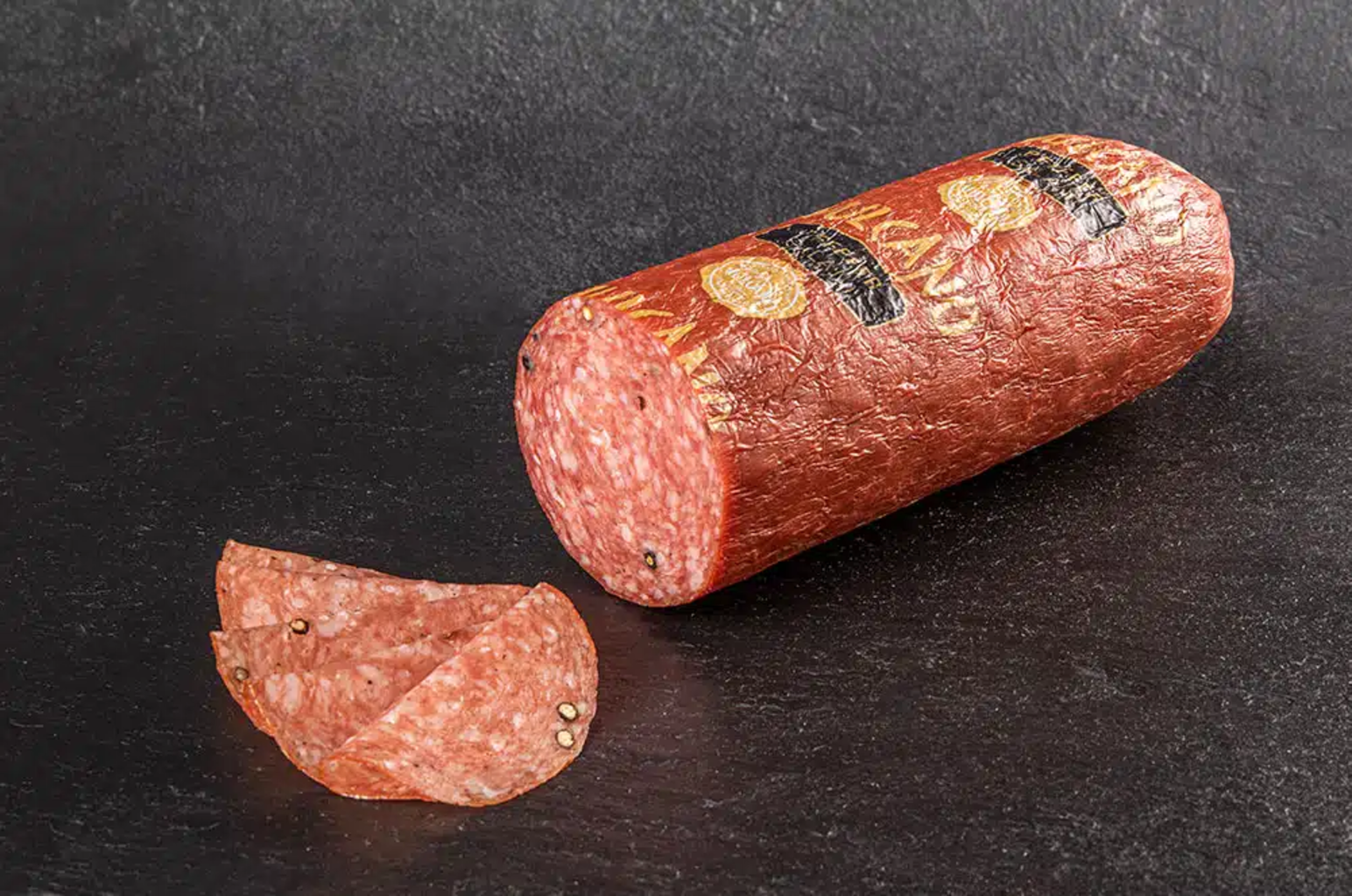 Este delicioso salami está hecho con la mejor carne de cerdo austriaca y se produce con el máximo cuidado. Los granos de pimienta enteros le aportan al embutido un sabor intenso y ligeramente picante.