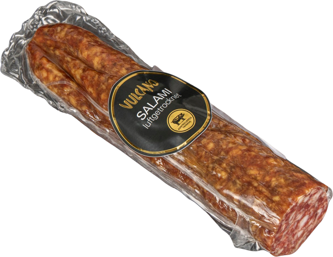 El salami Vulcano Exklusiv se caracteriza por la perfecta combinación de carnes seleccionadas, curadas lentamente al aire hasta conseguir un sabor pleno y armonioso. Ideal para tablas de embutidos, raclette o como sabroso aperitivo de sabor intenso. Sin gluten ni lactosa, es un placer para todos.