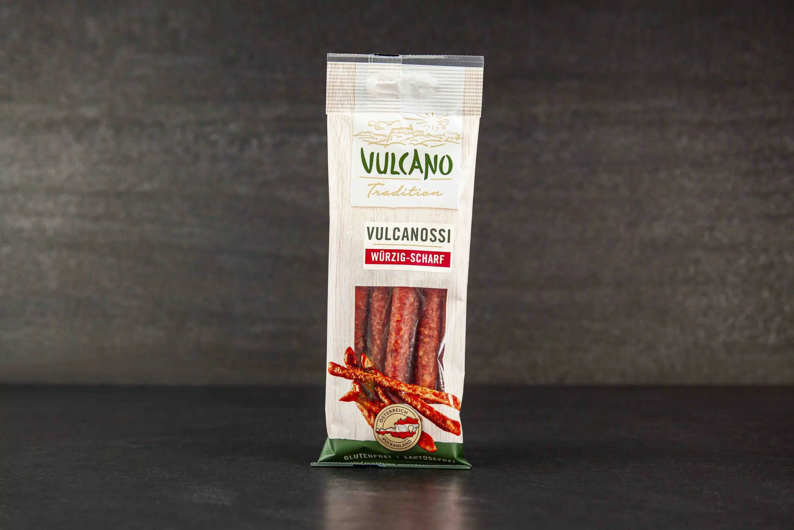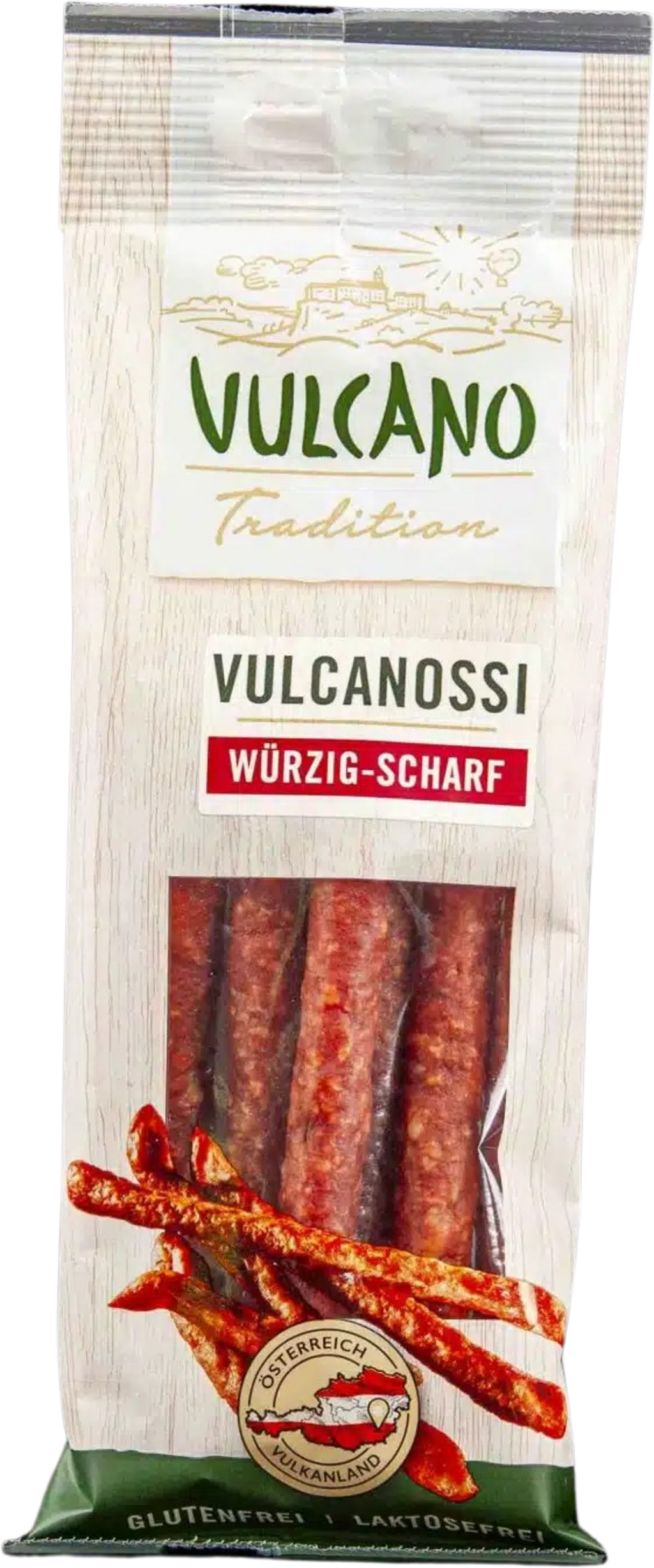 Los vulcanossi picantes son tiernos y deliciosos salamis elaborados con la mejor carne de cerdo y panceta. El condimento de especias seleccionadas y un ligero ahumado aseguran una experiencia de sabor única con una agradable nota especiada. Los vulcanossi no contiene gluten ni lactosa.