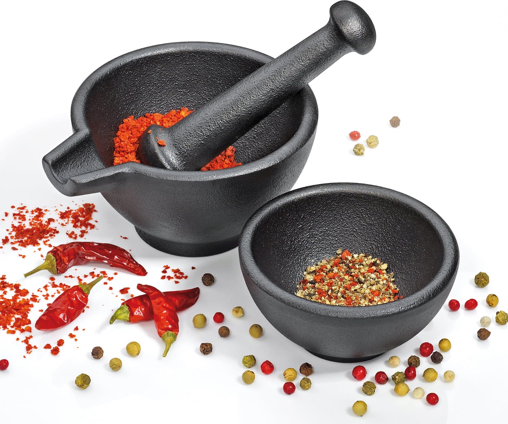Con el set de mortero de hierro fundido de Zassenhaus, las especias y las hierbas aromáticas desprenden todo su aroma. El material resistente garantiza estabilidad y un molido perfecto, ya sea pimienta, hierbas aromáticas o frutos secos. Gracias al práctico cuenco, puedes trabajar sin esfuerzo incluso pequeñas cantidades o verter salsas y adobos de forma limpia. Ideal para quienes te gusta experimentar con ingredientes frescos y aprecias la calidad.