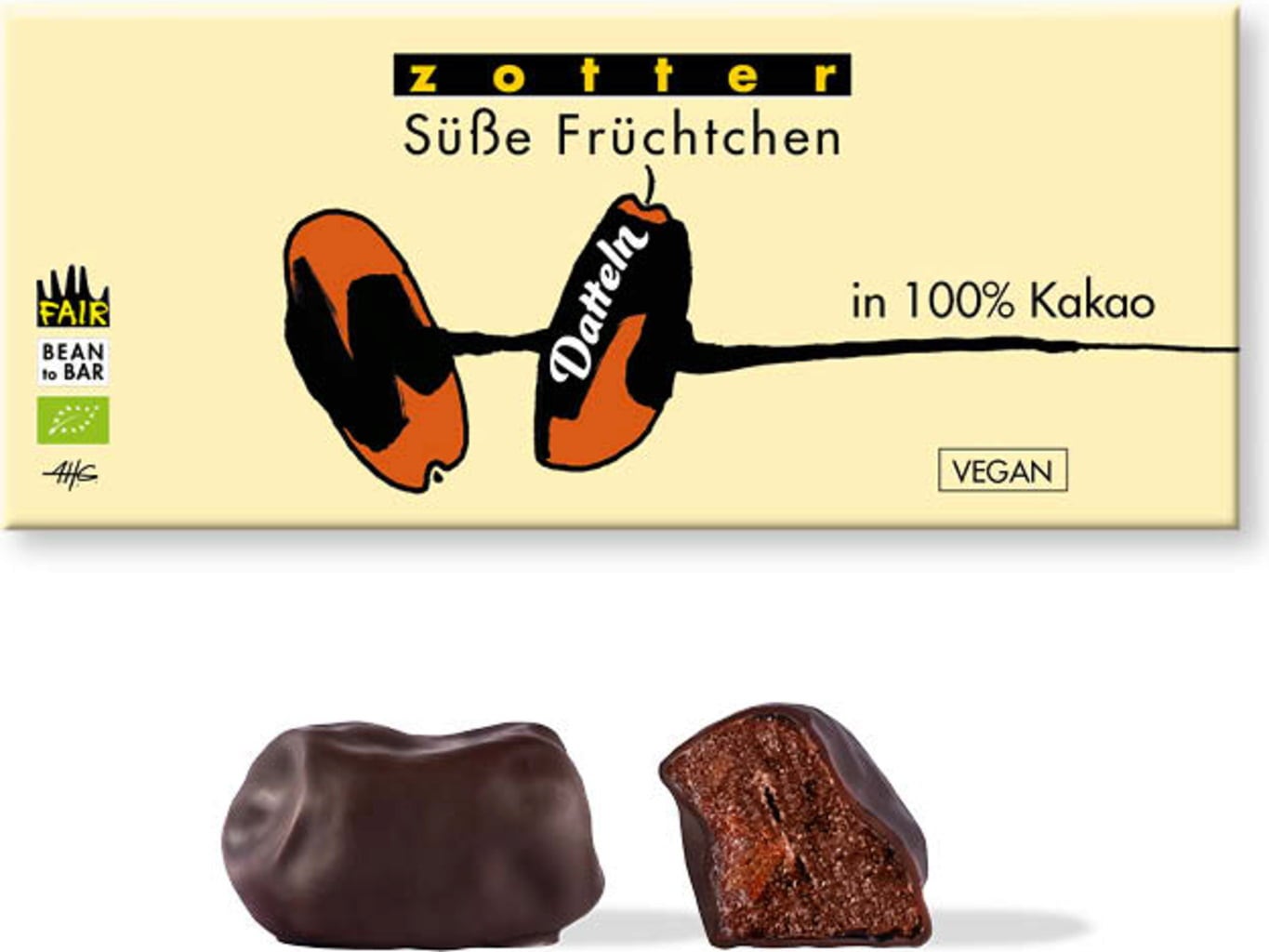Esta dulzura natural convierte a los dátiles en el compañero perfecto para la cobertura: una cobertura de chocolate crujiente y casera con un contenido del 100% de cacao, ¡y sin azúcares añadidos! La armoniosa interacción con la fruta hace que la cobertura pura no sea amarga en absoluto. Esta creación no sólo es agradablemente dulce y tiene un suave sabor a dátil, ¡sino que además es completamente vegana!