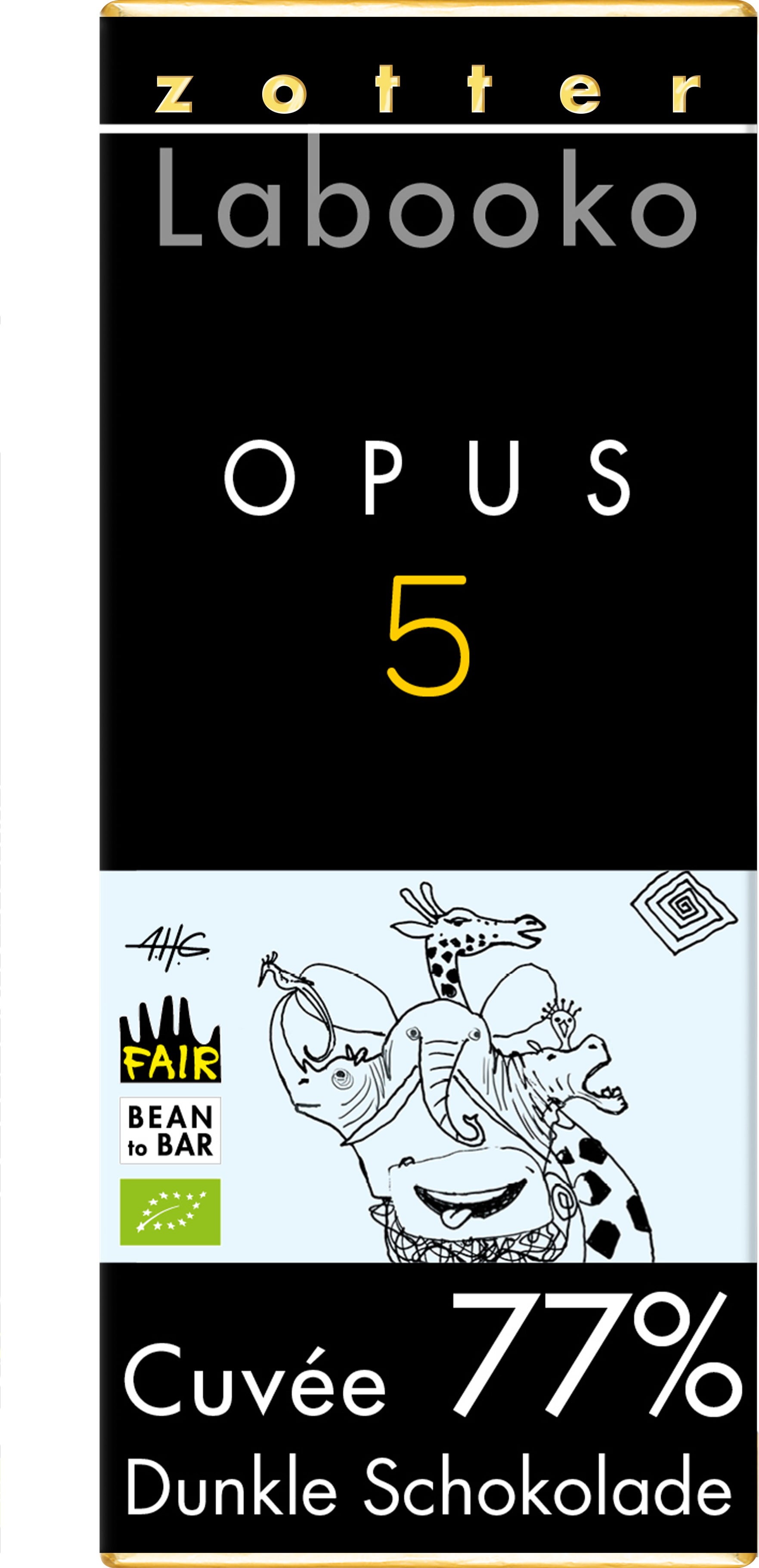El chocolate Opus 5 con 77 % de cacao es una mezcla premium única de variedades de cacao raras cultivadas a altitudes inusuales; normalmente, el cacao es originario de las tierras bajas. Esta mezcla combina granos de las regiones montañosas de cinco países: Ecuador, Colombia, Guatemala, Perú y Uganda.