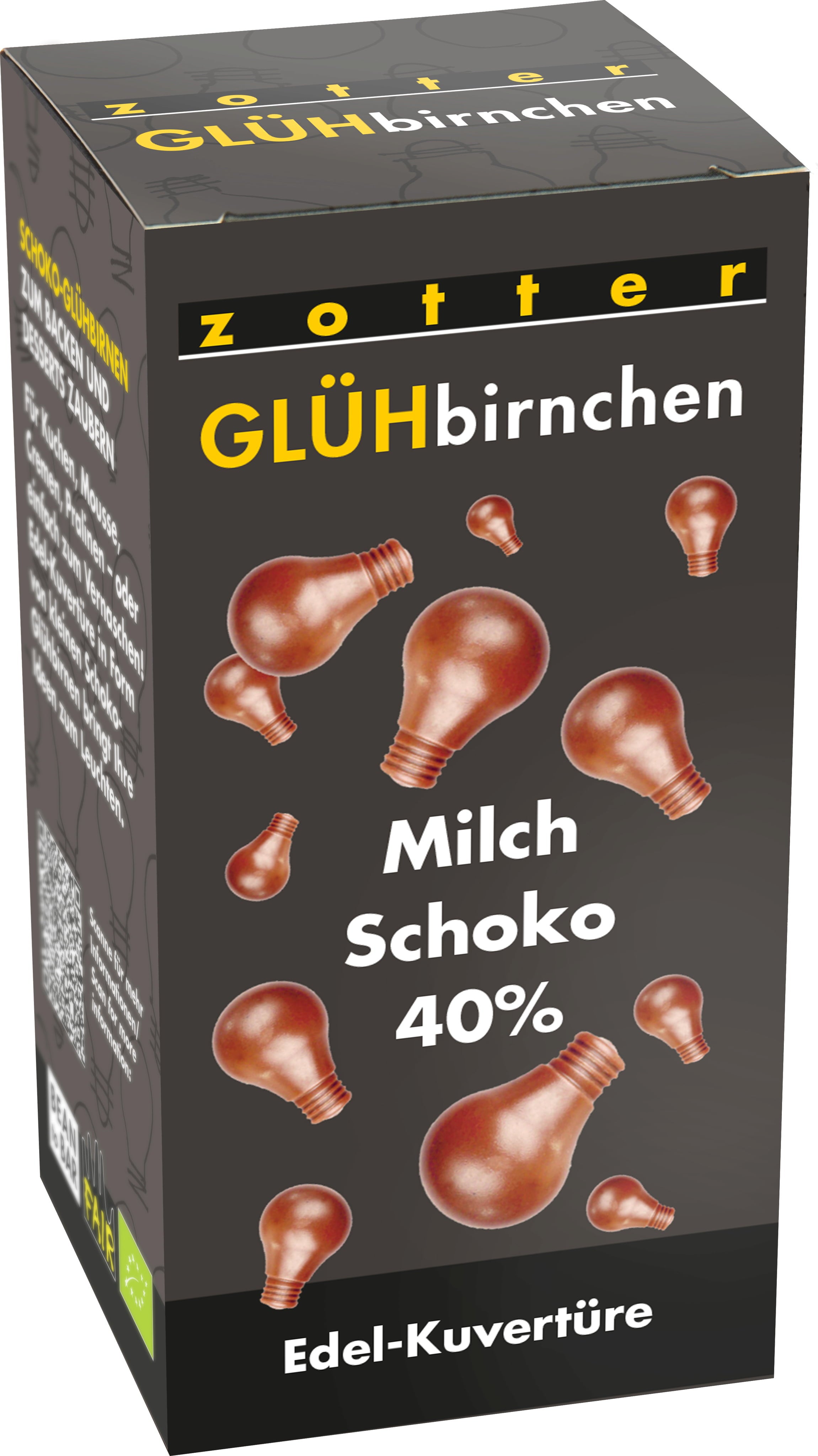 ¡Las bombillas de Zotter iluminan tus ideas! Gracias a su forma es más fácil de utilizar para la preparación de coberturas, pero también se prestan para la creación de originales decoraciones. Además, son deliciosas para comer.