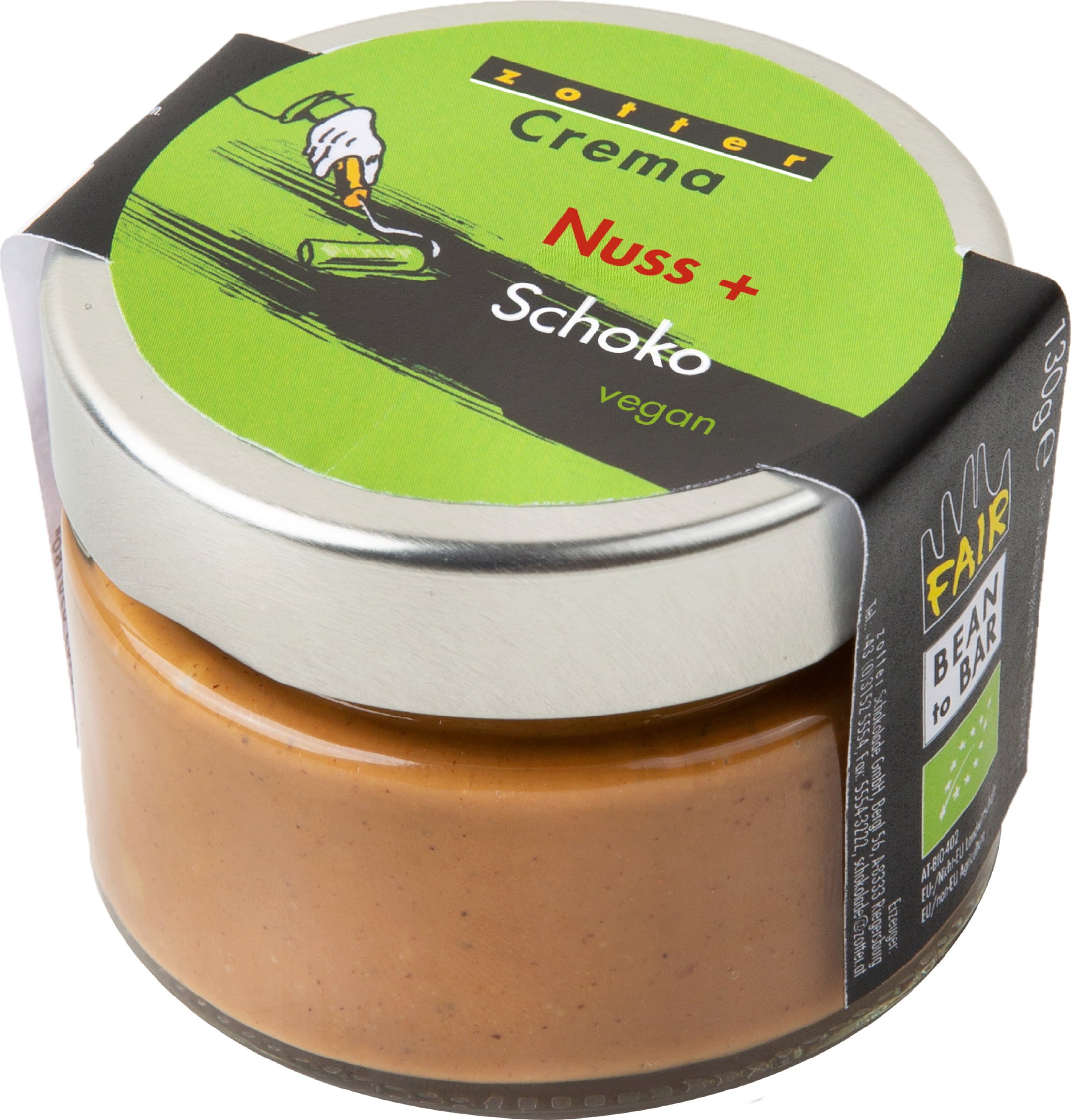 Una crema vegana elaborada a base de chocolate negro con un 70% de cacao y el mejor turrón de avellanas de Zotter. La crema se combina con una pizca de zumo agraz (zumo ácido de uvas verdes). Debido a su fina acidez, el zumo agraz tiene el mismo efecto que le vino de limón sin alcohol, dándole a la crema una nota chispeante muy sutil.