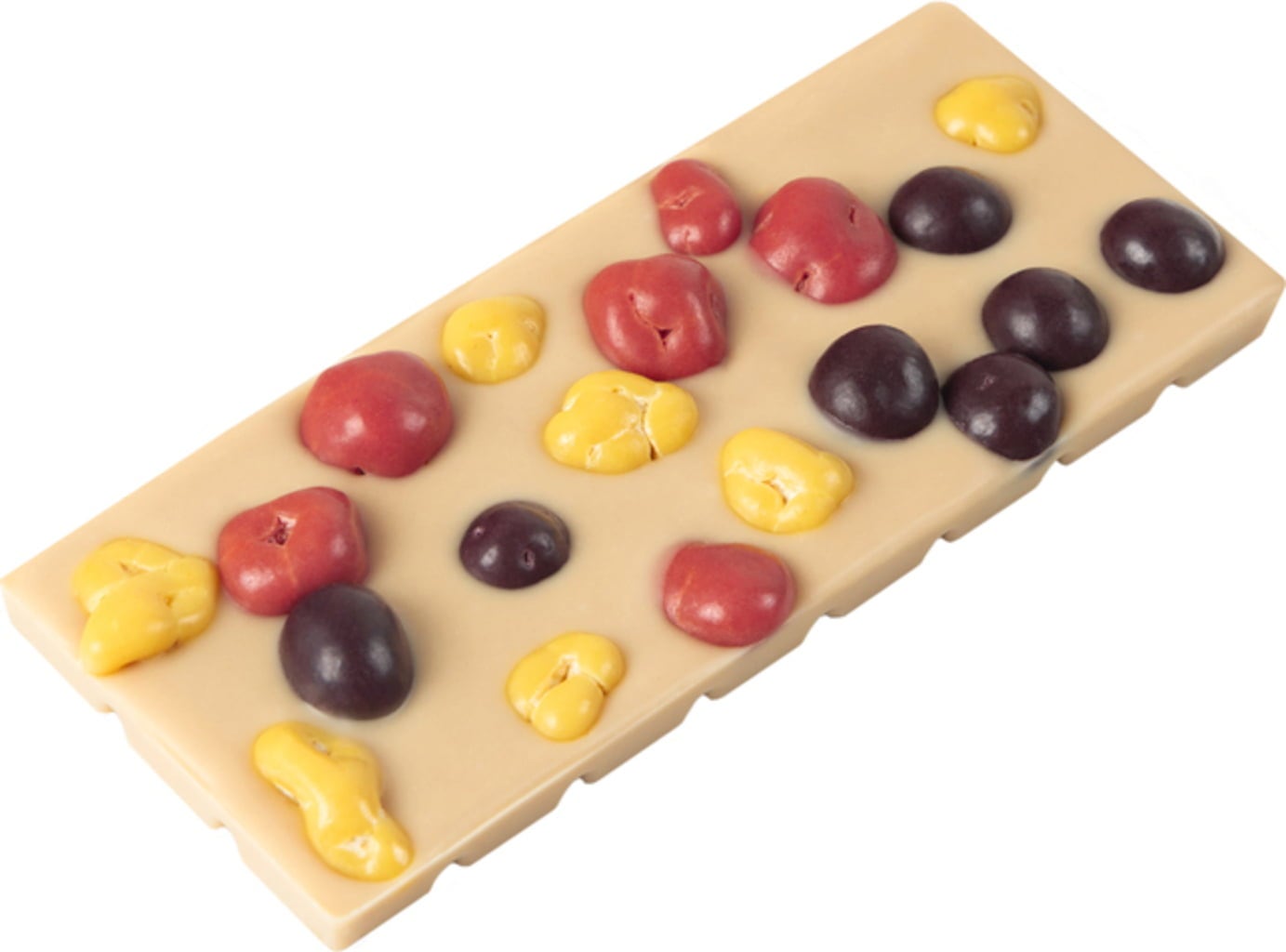 Por encima baila un confeti de crujientes y coloridas bolitas de chocolate de tres variedades. Destacan las fresas liofilizadas en cobertura de fresa rosa. Junto a ellas, trozos de fruta de la pasión cubiertos de cobertura de fruta de la pasión amarillo sol. El trío se completa con arándanos en una cobertura azul oscuro intenso. Los fantásticos y vibrantes colores se crean de forma totalmente natural a partir de las frutas y bayas utilizadas