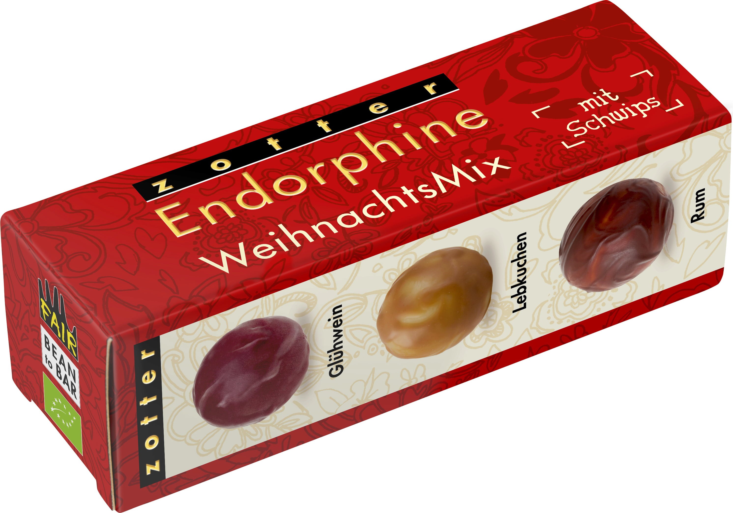 Como es bien sabido, las endorfinas proporcionan sentimientos de felicidad, ¡especialmente cuando provienen de Zotter! ¡La mezcla navideña con 3 bombones en las variedades de ron, vino caliente y pan de jengibre seguramente hará felices a los paladares expertos!